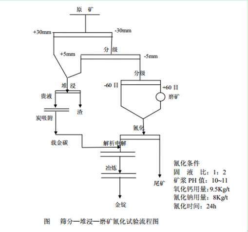 此工藝的篩分分級部分,原礦經過原礦給礦機給入皮帶運輸機,運輸至雙層振動篩進行篩分。篩分出來+30mm和+5mm的礦石混合一起去堆浸,篩下-5mm優先經過旋流器分級,旋流器底流經過一段磨礦後和旋流器溢流混合後去全泥氰化炭吸附係統。結合礦樣粒度分析及現場實際情況,堆浸產量1600t/d,2個月築一10萬噸級堆浸,全泥氰化2400t/d設計;氰化浸出解析電解部分,篩下-60目礦漿通過泵輸送至浸出槽,開始浸出吸附。最終載金碳通過解析電解得到金泥;堆浸部分,礦石經過築堆、噴淋、貴液吸附,最終載金碳通過解析電解得到金泥;濕法冶煉部分,解析電解得到的金泥定期通過濕法冶煉係統,最終得到產品99.9%的金錠;尾礦處理部分,生產第一年的尾礦采用平地築壩堆存,第二年至以後的尾礦回填采坑。